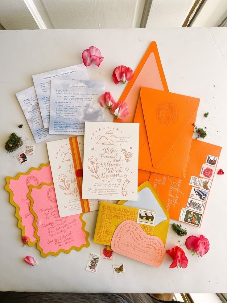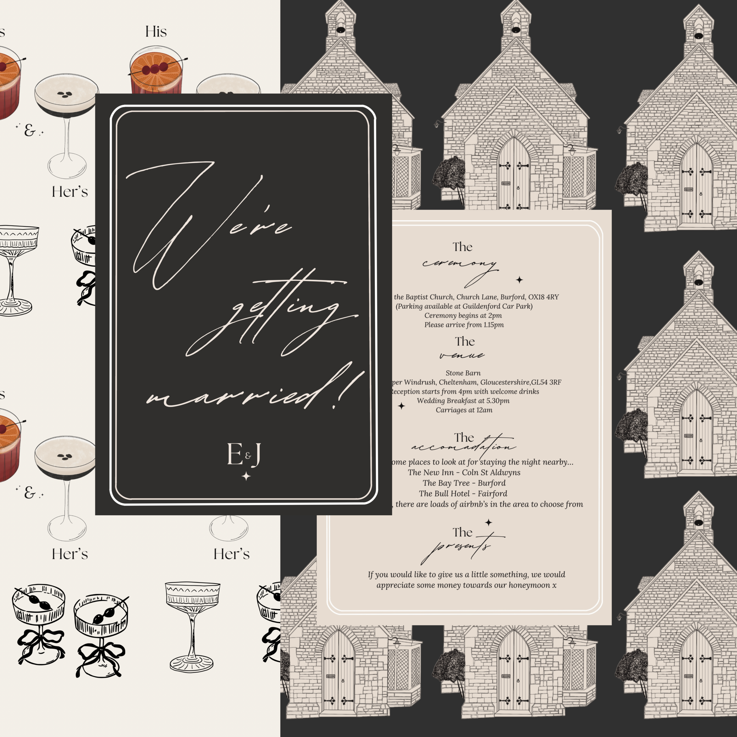 Luna. Could only be inspired by the vast night sky of the moon and stars. She is the queen of monochrome. Elegant but bold. Like candlelight on a cozy winters evening. Using neutral tones, soft lettering and dreamy details. We can add hand drawn illustrations and bold patterns to complement the minimalist style of this collection. Rest assured Luna will add much depth and romance to any scene on your big day.
